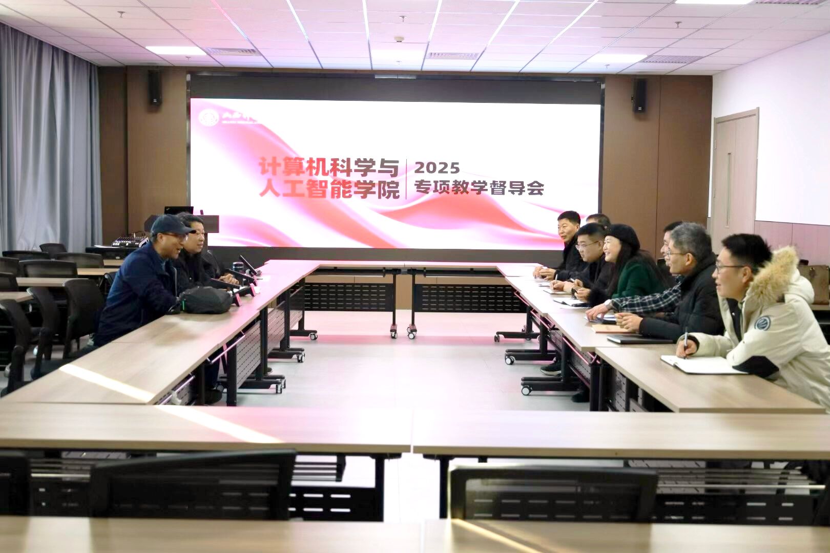会上,王洁副经理介绍了与会人员,阐明了本次专项教学督导会的背景与核心目标,并强调了建立教学质量闭环、推动教师专业成长的重要意义。随后,贾郭军、安秋生、陈够喜三位老师依次代表计算机科学与技术、人工智能、网络空间安全专业进行了系统汇报,他们围绕各自督导专业的教学现状、课程建设、实践环节、人才培养方案等方面进行详细阐述,全面展示了本专业教学工作的实际进展与优化方向。
