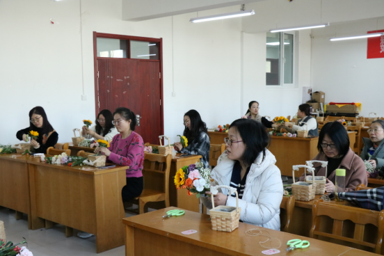 活动在轻松愉快的氛围中展开,花艺师首先为教师们讲述了花材的种类和插花的原则,插花中要注意黄金分割比例、色彩、主次关系、平衡等,然后进行了剪裁示范、插花表演。老师们听的很认真,看的也仔细,大家结合各自手中的花材特点和审美情趣,大胆发挥自己的想象,经过不断的尝试,制作出一篮篮错落有致、生机盎然的作品。活动结束后,老师们提着自己亲手制作的花篮合影留念。