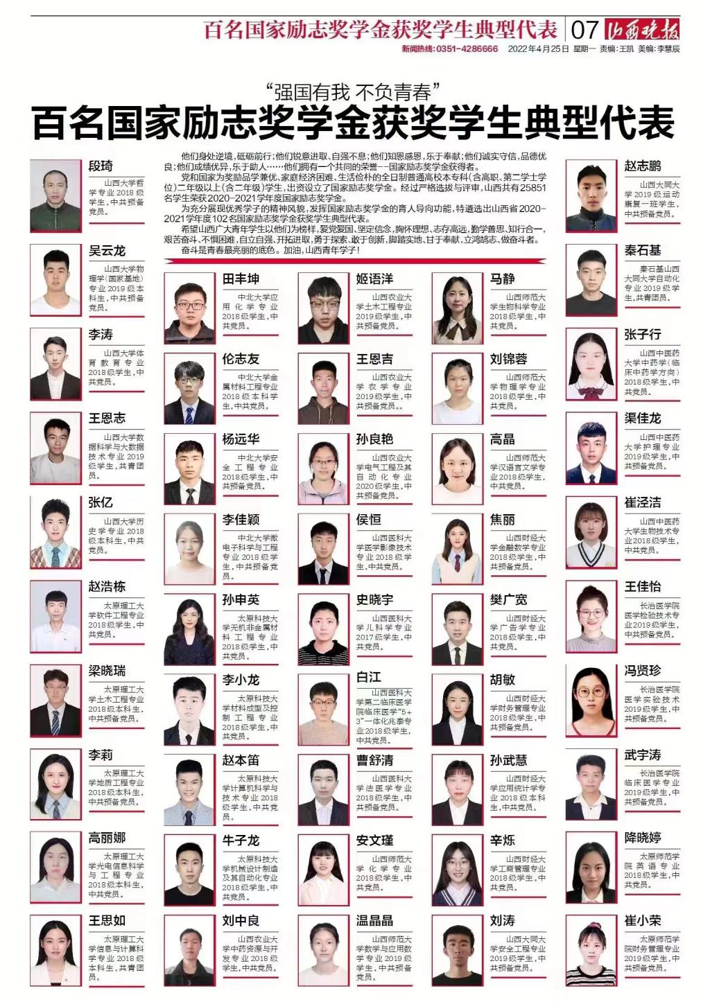 4月25日,《山西晚报》刊登了《“强国有我、不负青春”百名国家励志奖学金获奖员工典型代表》,公司学子温晶晶成功入选。
