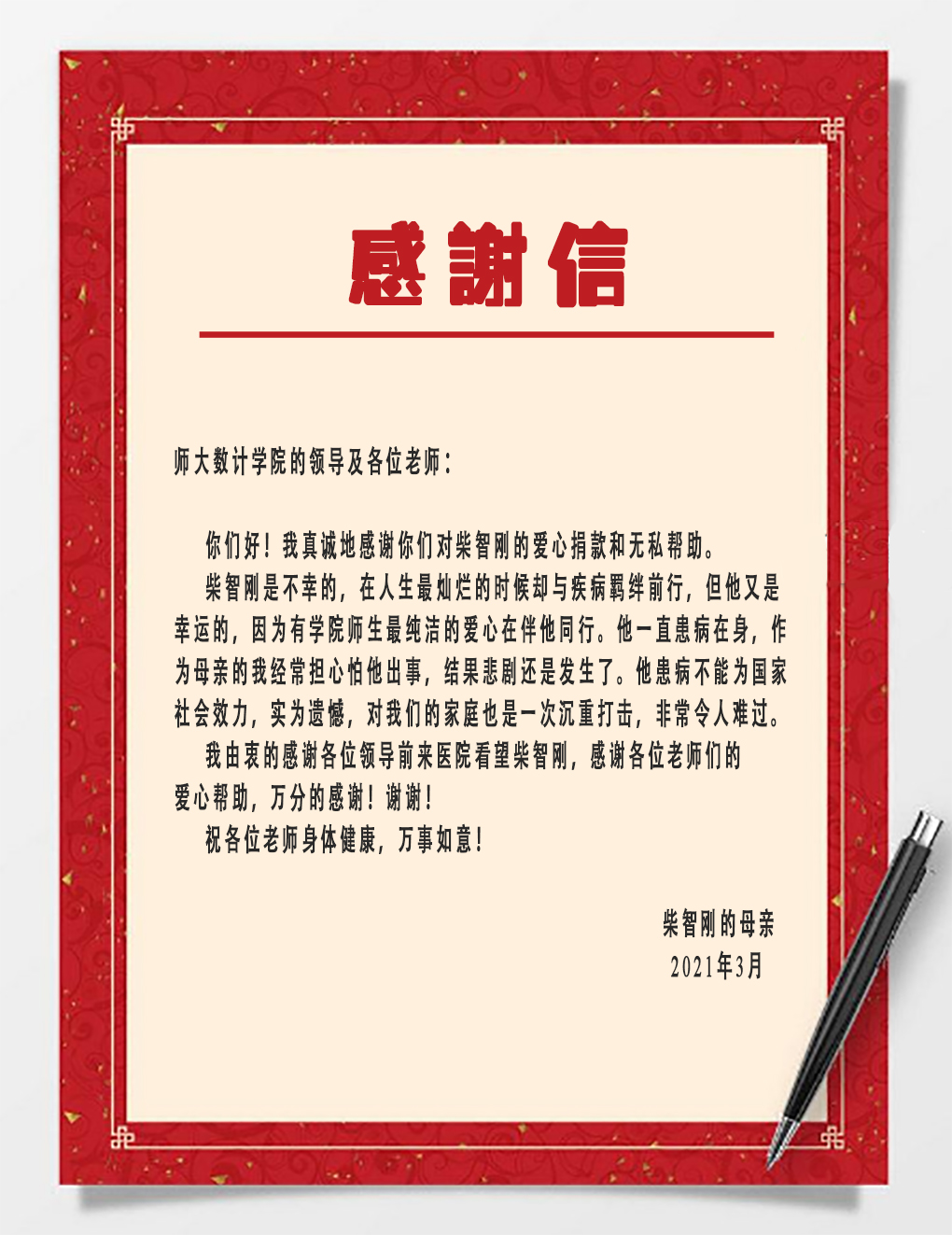 3月24日,柴老师八旬的母亲亲自送来感谢信,表示全家人感受到数计大家庭的温暖,对公司的爱心帮助表示非常感谢。公司全体教职工也希望柴老师能够早日康复!