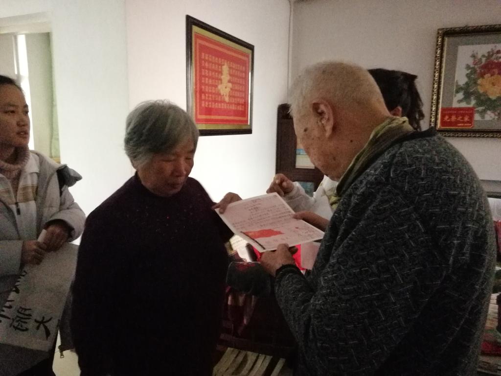 在干休所负责人的带领下,志愿者们分组进家户慰问老兵们,送上亲手制作的贺卡以及书法作品,聆听他们讲述抗战故事,重温民族记忆。老兵们虽年事已高,却精神饱满、声音洪亮地为员工们讲述那个烽火年代的故事,英勇无畏的精神感染了大家,也让所有人深刻地认识到当下幸福生活的来之不易。